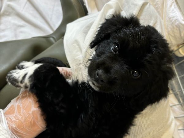 It took four people to lift the heavy pallet and it was a little while before we were able to coax him out because he was so scared. When we did manage to get a closer look at him, we saw that Teddy was dirty, a bit stinky, and covered in fleas.